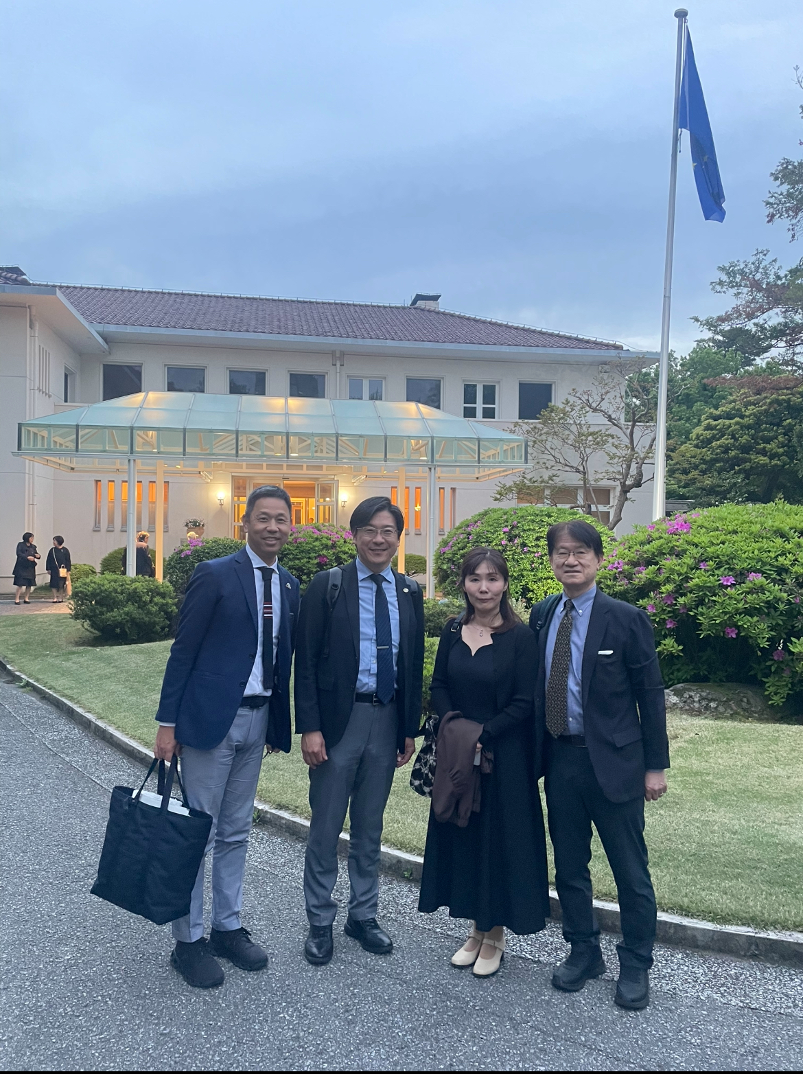 4月17日(金)に開催された全国日独協会連合会総会の懇親会がドイツ大使館公邸で開催され、西島副会長、広瀬産業交流委員長が参加されました。西島副会長を中心に、全国各地から集まった日独協会の役員の皆さまと日独交流活動についての情報交換を行いました。愛知県からは、名古屋日独協会の皆さまが参加され、シュタムティッシュなどのイベントを合同で開催するなどの連携して国際交流活動を行いたいと意見交換をしました。